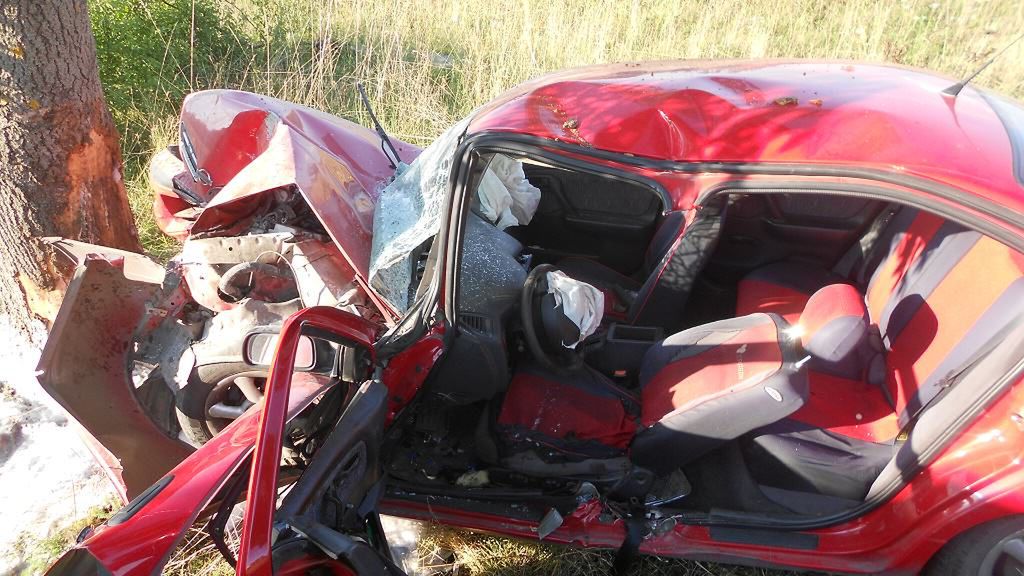 Groźne czołowe zderzenie auta osobowego z drzewem