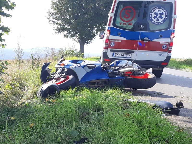 Groźny wypadek z udziałem motocyklisty w powiecie opatowskim. W wypadku brał udział mieszkaniec Ostrowca Św. [Foto]
