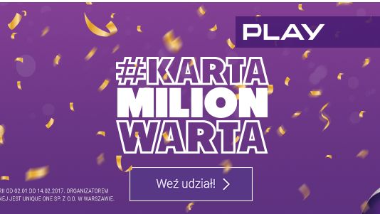 Dodatkowo od dzisiaj można, każdy zarejestrowany numer na kartę w PLAY, zgłosić do loterii „Karta milion warta”, w której do wygrania aż 1 mln złotych jako nagroda główna oraz 250 kart po 1000 zł i 5 kart po 100 000 zł. Wystarczy zarejestrowany numer telefonu zgłosić do gry na stronie internetowej kartamilionwarta.pl lub bezpłatnym SMSem o treści GRAM pod numer 465.