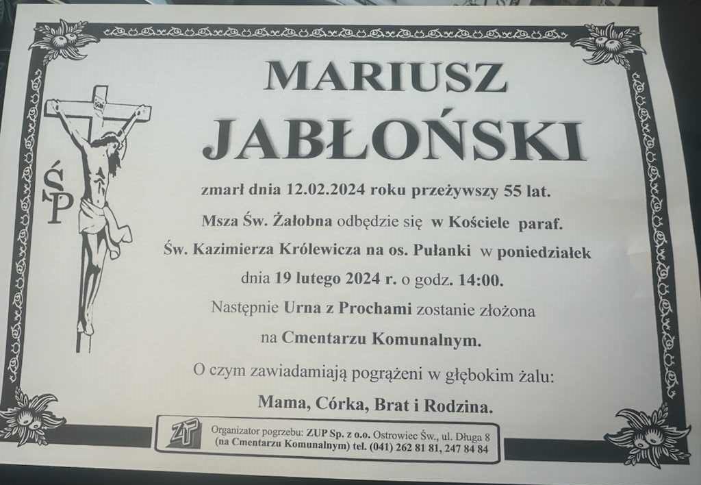W poniedziałek 12 lutego 2024 roku w wieku 55 lat odszedł redaktor Mariusz Jabłoński, właściciel portalu OstrowiecNews.pl