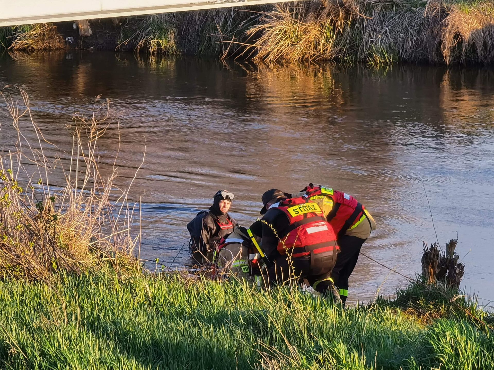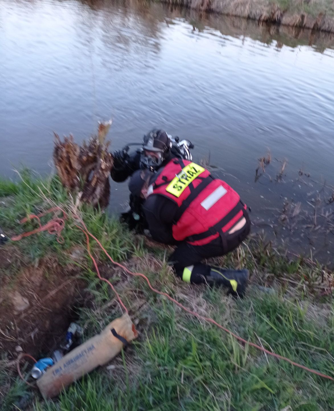Następnego dnia (26 kwietnia br.) wznowiono poszukiwania do których zaangażowano również grupę nurków z Policji. Tym razem sprawdzono koryto rzeki z użyciem sonaru i wykrywacza metali. Wspólne działania zakończyły się sukcesem. Poszukiwane narzędzie zbrodni zostało odnalezione. Tym razem akcja trwała ponad 5 godzin.