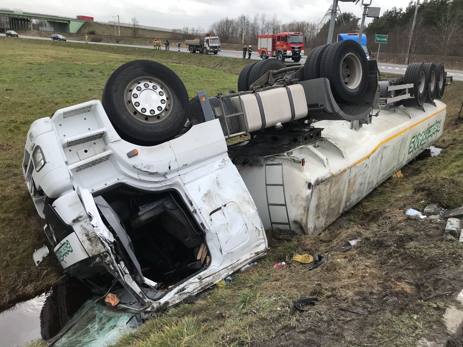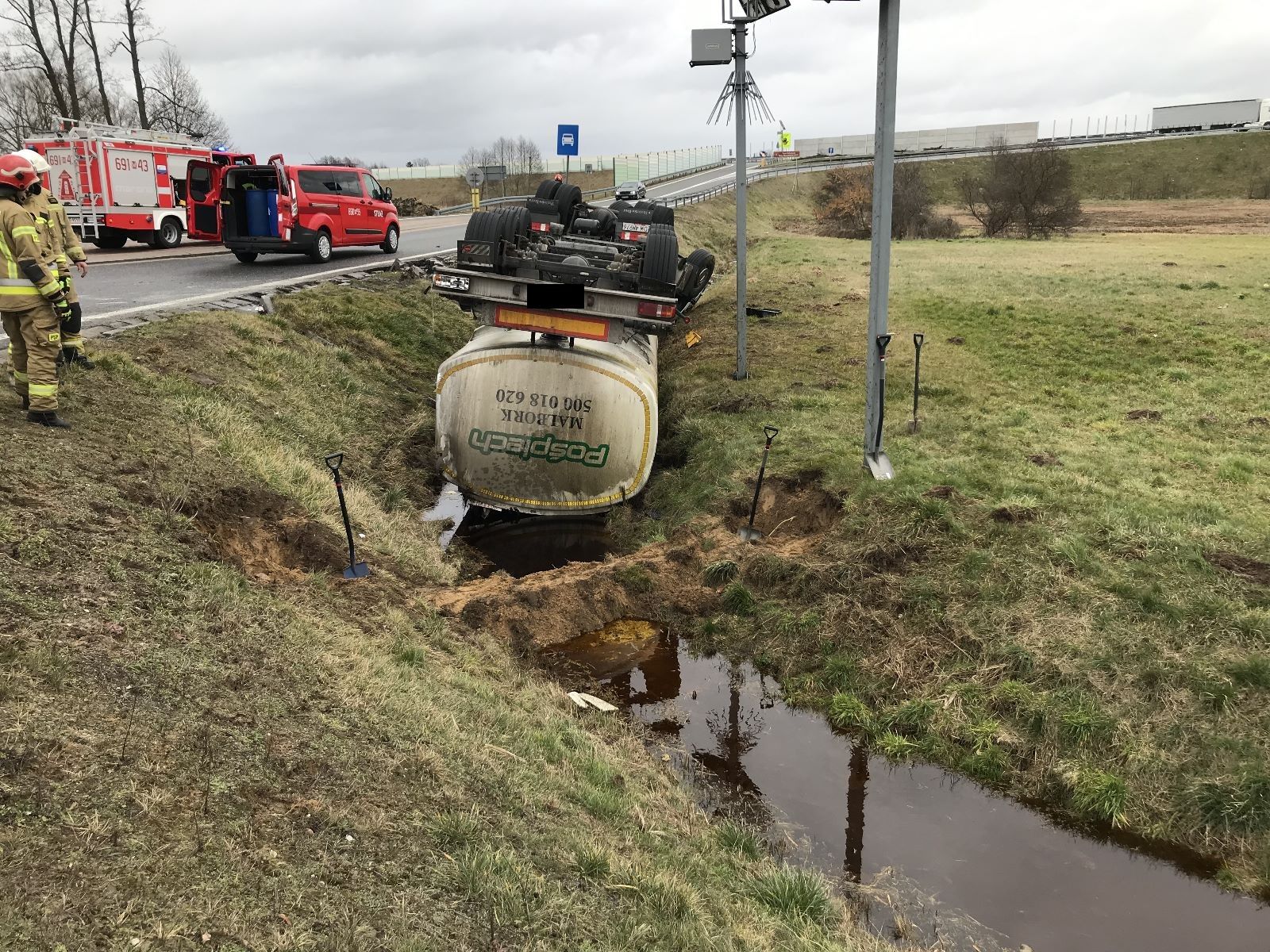 Po przybyciu na miejsce SGRChem przepompowano pozostałą w zbiorniku ciecz i zanieczyszczoną wodę z rowu do podstawionej przez przewoźnika dodatkowej cysterny. Następnie strażacy zabezpieczali i oświetlali miejsce zdarzenia do czasu usunięcia ciężarówki z rowu i uprzątnięcia jezdni.