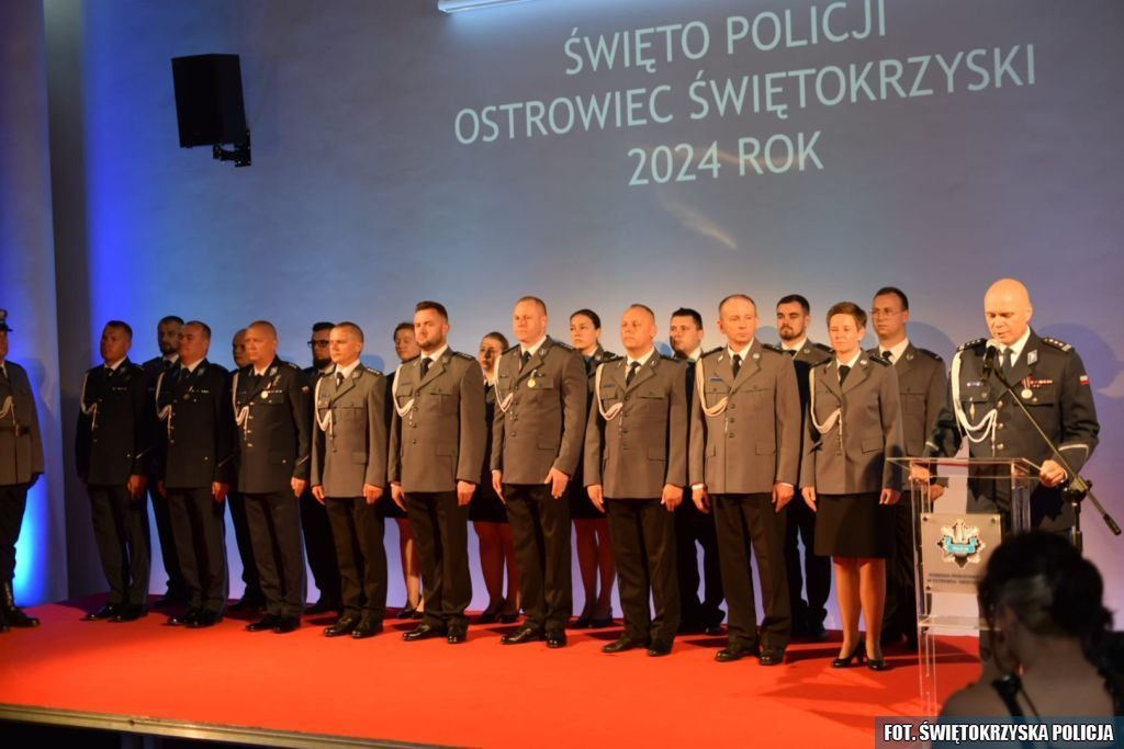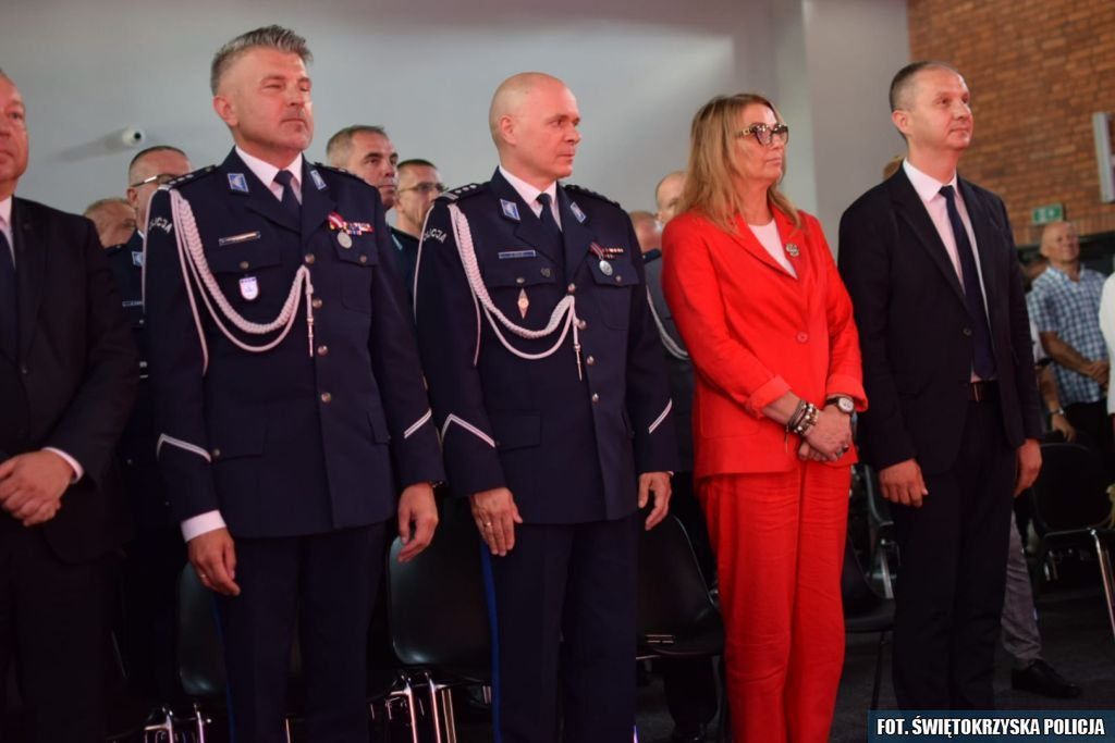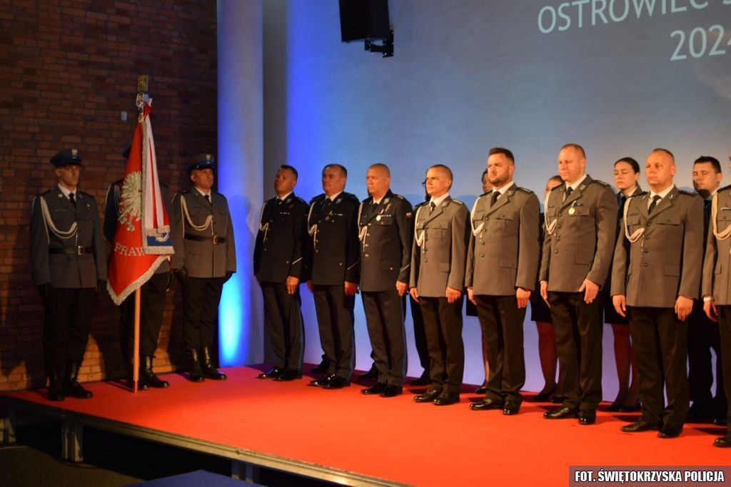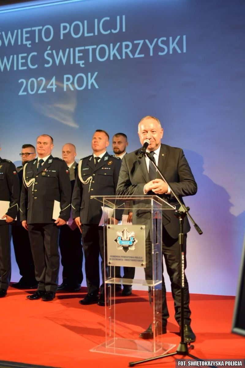 Po czym głos zabrali zaproszeni goście, którzy w swoich przemówieniach składali życzenia z okazji Święta Policji, a także wyrazili podziękowania dla policjantów pełniących służbę na terenie powiatu ostrowieckiego. Kolejno policjanci otrzymali od Starosty Powiatu Ostrowieckiego, Prezydenta Miasta Ostrowca Świętokrzyskiego oraz Burmistrzów i Wójtów samorządów miast i gmin powiatu ostrowieckiego wyróżnienia.