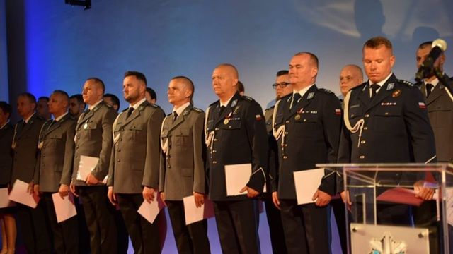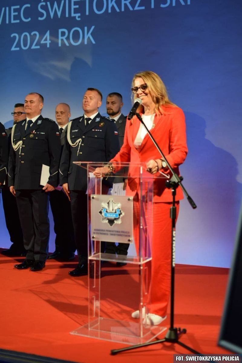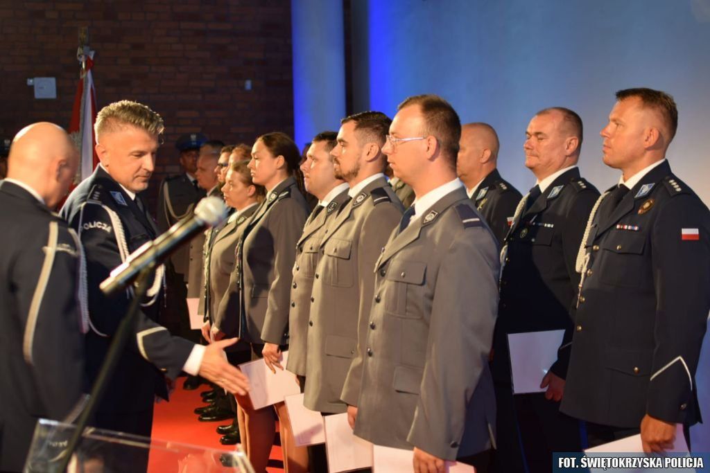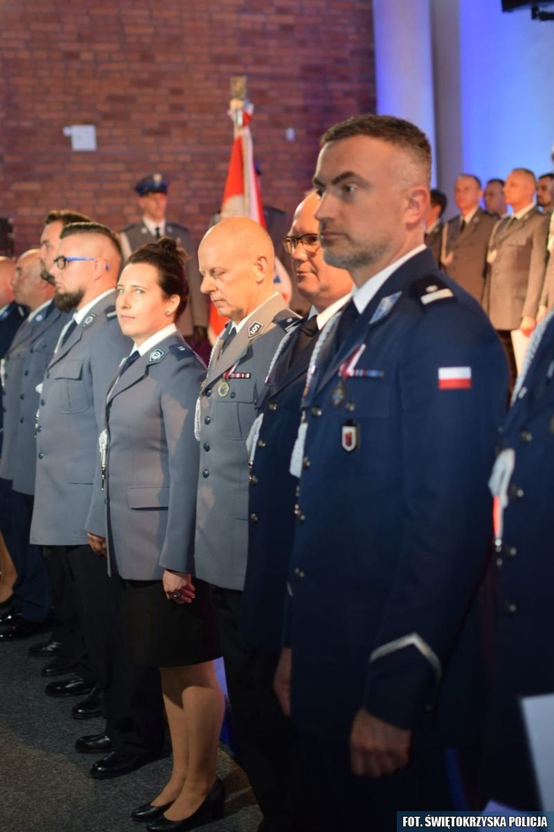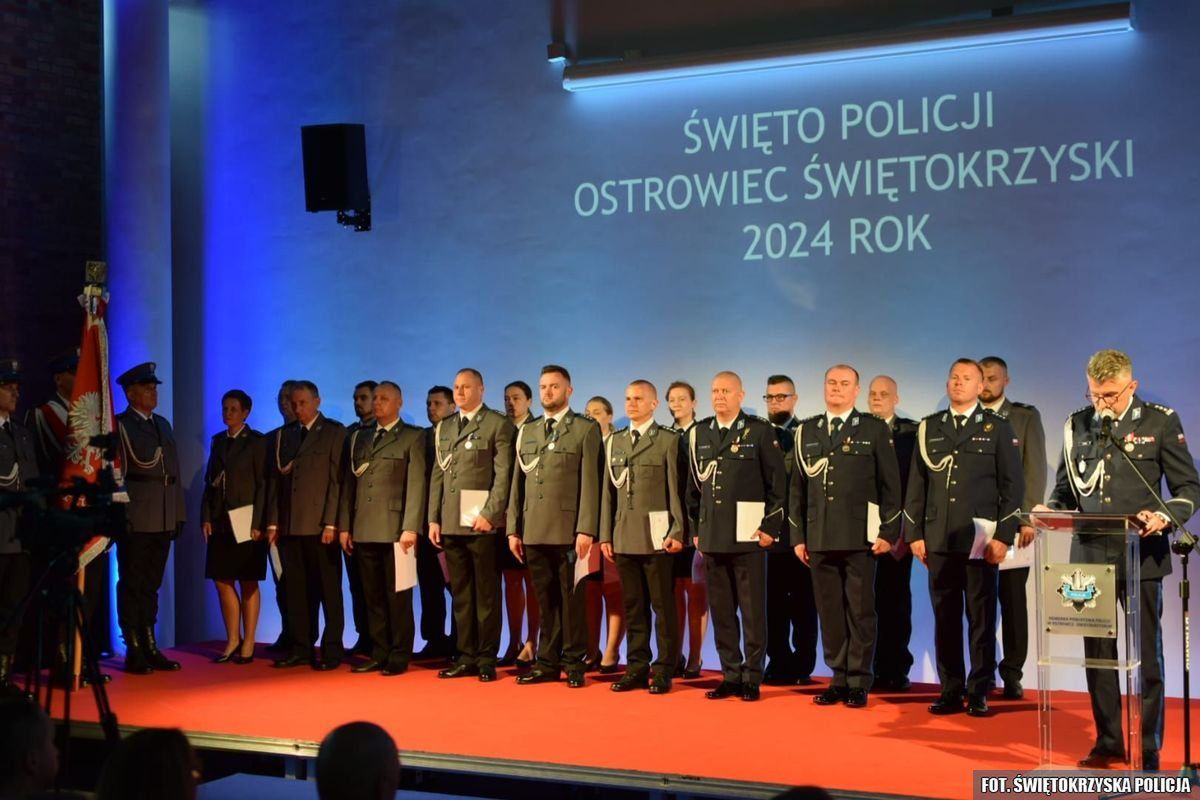 Po czym głos zabrali zaproszeni goście, którzy w swoich przemówieniach składali życzenia z okazji Święta Policji, a także wyrazili podziękowania dla policjantów pełniących służbę na terenie powiatu ostrowieckiego. Kolejno policjanci otrzymali od Starosty Powiatu Ostrowieckiego, Prezydenta Miasta Ostrowca Świętokrzyskiego oraz Burmistrzów i Wójtów samorządów miast i gmin powiatu ostrowieckiego wyróżnienia.