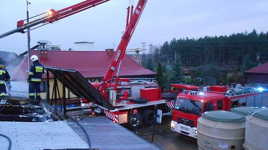 Po przybyciu na miejsce zdarzenia stwierdzono, że spod dachu budynku wydobywa się dym. Ratownicy zostali poinformowani, że w obiekcie przeprowadzono ewakuację i w chwili obecnej nikt w nim nie przebywa. Działania zastępów straży pożarnej polegały na zabezpieczeniu miejsca zdarzenia, odłączeniu energii elektrycznej w budynku, wejściu na dach przy użyciu drabiny przystawnej, wykonaniu dostępu do przestrzeni pod dachem. Następnie rota w aparatach ochrony dróg oddechowych podała jeden prąd piany na palącą się konstrukcję dachu. Przy pomocy kamery termowizyjnej ustalono najgorętsze miejsca dachu (dach pokryty blachą) i wykonano kolejne dwa otwory. W miejsca te podano pianę gaśniczą. Po zlokalizowaniu pożaru przystąpiono do zrywania dachu co było wymuszone jego konstrukcją. Po ugaszeniu głównych źródeł ognia wprowadzono w aparatach ODO rotę na poddasze celem zlokalizowania potencjalnych wtórnych źródeł ognia. Rota przy pomocy kamery termowizyjnej lokalizowała miejsca źródeł ognia i chłodziła je za pomocą piany. Dalsze działania polegały na usunięciu pozostałości spalonej konstrukcji dachu. Przez cały czas trwania akcji miejsce zdarzenia monitorowano przy użyciu kamery termowizyjnej. W międzyczasie sprawdzono pomieszczenia budynku na obecność tlenku węgla. Obecności CO nie stwierdzono. W działaniach brało udział również Pogotowie Energetyczne i Policja.