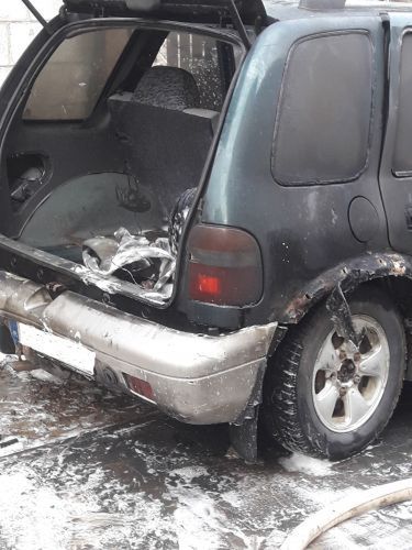 Na terenie posesji palił się samochód osobowy marki KIA. W wyniku zdarzenia nikt nie odniósł obrażeń. Działania zastępów straży pożarnej polegały na zabezpieczeniu miejsca zdarzenia oraz podaniu jednego prądu piany ciężkiej w natarciu na palący się pojazd. Po ugaszeniu ognia schłodzono zbiornik LPG i zakręcono zawór. Po zakończeniu działań gaśniczych stwierdzono, że ze zbiornika z benzyną wycieka paliwo. Pod nieszczelny zbiornik podstawiono wanienki wyłapujące, następnie podniesiono samochód przy pomocy poduszek pneumatycznych, powiększono powstałe wcześniej pęknięcie i spuszczono pozostałe paliwo.