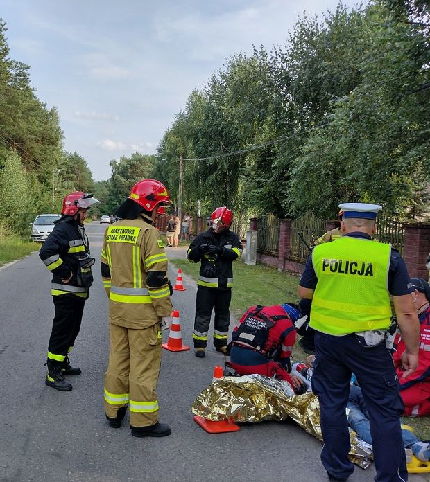– Po dojeździe na miejsce akcji stwierdzono, że na poboczu jezdni przy wywróconym skuterze leży poszkodowany, przytomny mężczyzna w wieku 49 lat. Działania ratowników PSP polegały na zabezpieczeniu miejsca zdarzenia oraz udzieleniu rannemu kwalifikowanej pierwszej pomocy. Następnie mężczyznę ułożono na desce ortopedycznej i przekazano przybyłej na miejsce załodze Lotniczego Pogotowia Ratunkowego. Ratownicy LPR po przebadaniu poszkodowanego stwierdzili brak poważnych obrażeń, a zadysponowana na teren akcji karetka pogotowia przetransportował poszkodowanego do pobliskiego szpitala. Na tym działania zakończono, akcja trwała godzinę – informuje mł.bryg. Barbara Majdak, oficer prasowy Państwowej Straży Pożarnej w Ostrowcu Świętokrzyskim.