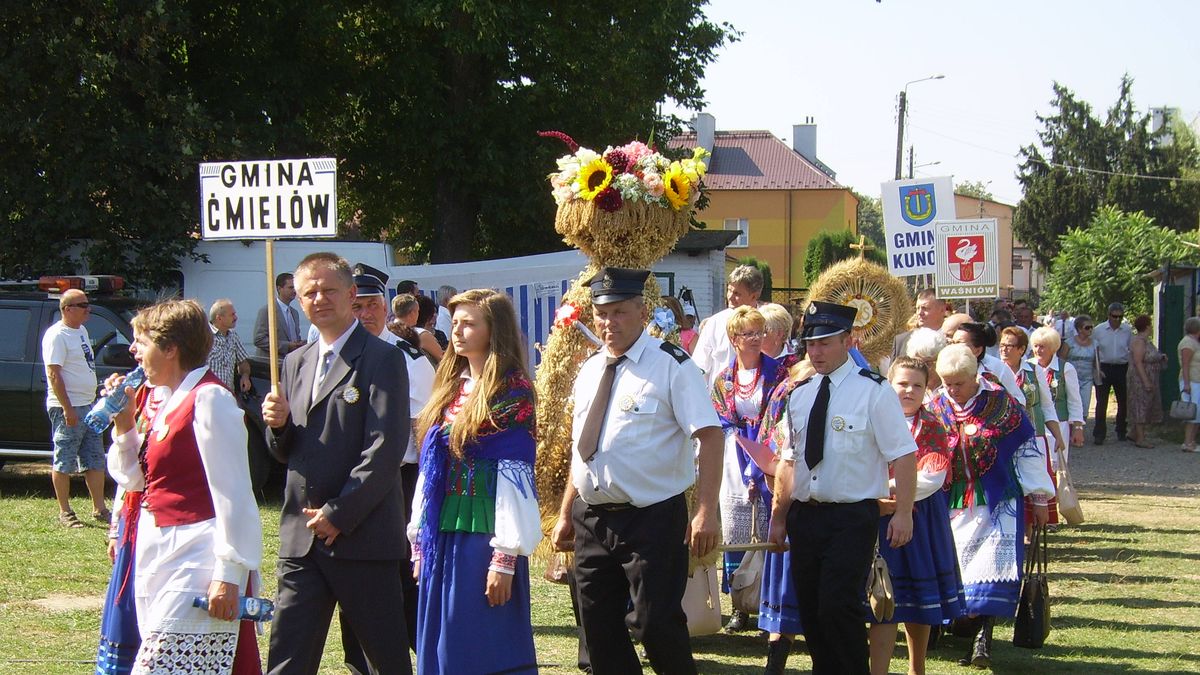 13.30 – Uroczysty przemarsz korowodu dożynkowego z Pocztami Sztandarowymi, wieńcami dożynkowymi i uczestnikami na stadion w Ćmielowie.