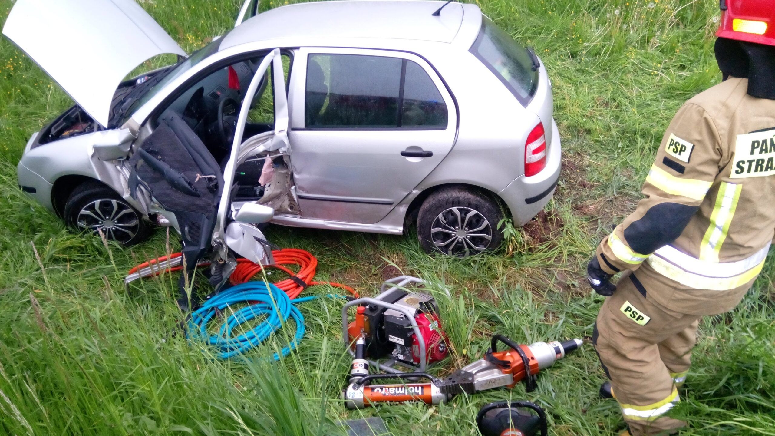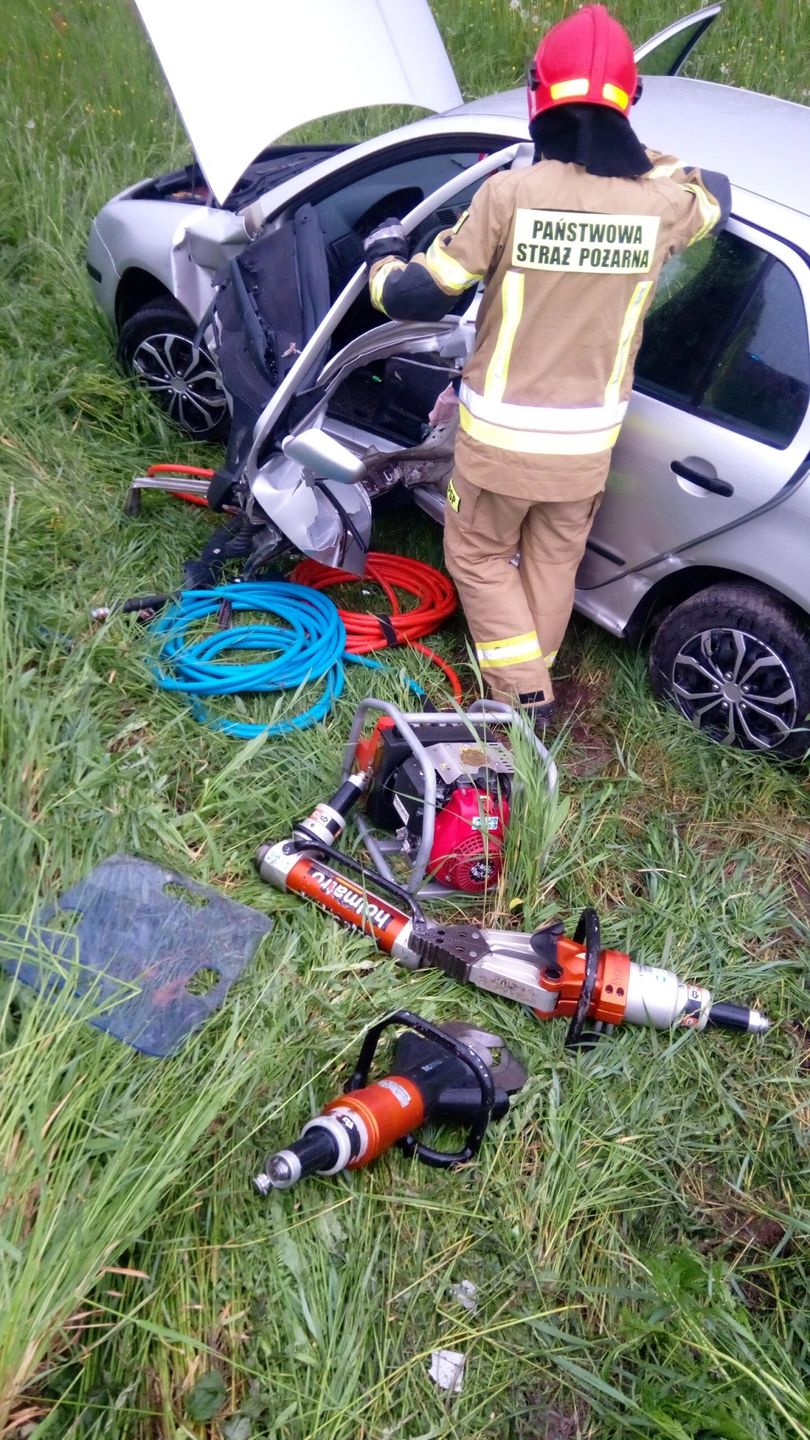 – Po dojeździe na miejsce zdarzenia zastępów straży pożarnej stwierdzono, że w miejscowości Wygiełzów, samochód osobowy uderzył w barierę energochłonną i wypadł z drogi. Pojazd stał na kołach obok nasypu drogi, na pobliskiej łące. Brak wycieków płynów eksploatacyjnych. Samochodem podróżował jedynie kierowca, który w wyniku uszkodzenia nadwozia został uwięziony w pojeździe. Na miejscu zdarzenia znajdowała się Policja. Działania straży polegały na zabezpieczeniu miejsca zdarzenia, udzieleniu kierowcy pojazdu (osoba przytomna) wsparcia psychicznego. Następnie wykonano dostęp do osoby poszkodowanej przy pomocy urządzeń hydraulicznych. Po wydobyciu, mężczyznę przetransportowano na noszach typu deska do karetki pogotowia. Dalsze czynności dochodzeniowe prowadzi Policja – informuje asp. sztab. Robert Rędziak z Państwowej Straży Pożarnej w Opatowie.