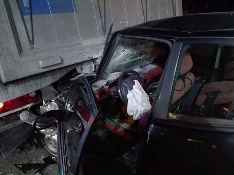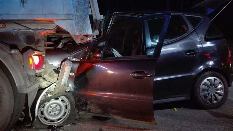 Auto marki Mercedes wbiło się w tył stojącego pojazdu ciężarowego marki VOLVO. Działania strażaków polegały na dotarciu do poszkodowanego, udzieleniu mu kwalifikowanej pierwszej pomocy oraz przekazaniu go przybyłemu na miejsce zdarzenia pogotowiu ratunkowemu. Następnie przystąpiono do usunięcia płynów eksploatacyjnych wyciekłych na skutek zderzenia oraz wyciągnięciu samochodu osobowego spod naczepy ciężarówki. Działania strażaków trwały około 2 godzin, a w akcji ratunkowej udział brały 2 samochody ratowniczo-gaśnicze (w tym 7 strażaków).