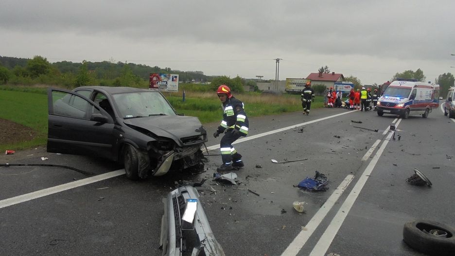 Po przybyciu ratowników na miejsce zdarzenia stwierdzono wypadek dwóch samochodów osobowych: Seat Cordoba i Opel Astra. Na miejsce zdarzenia dotarła również Policja oraz zespoły ratownictwa medycznego (ZRM). Obrażeń doznało łącznie 5 osób (w tym również dzieci), którym udzielono niezbędnej pomocy. Osobom poszkodowanym pomocy udzieliły ZRM-y. Poszkodowane osoby zostały zabrane do szpitala. Droga została zamknięta przez Policję na czas prowadzonych działań ratowniczych – wyznaczono stosowne objazdy. Działania zastępów PSP i OSP polegały na zabezpieczeniu miejsca zdarzenia, odłączeniu akumulatorów w uszkodzonych pojazdach. Na rozlane płyny eksploatacyjne posypano sorbent. Po zakończeniu czynności dochodzeniowych przez Policję strażacy pomogli w udrożnieniu ruchu drogowego. Na tym działania zakończono.