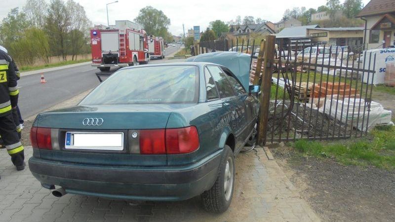 Po przybyciu na miejsce zdarzenia ratowników stwierdzono, że samochód osobowy marki Audi 80 uderzył w przydrożne metalowe ogrodzenie posesji. Na miejscu obecny był patrol Policji i Zespół Ratownictwa Medycznego. Pojazdem podróżowały 2 osoby: kobieta lat 30, która została zabrana przez ZRM do szpitala oraz mężczyzna bez obrażeń pozostający na miejscu wypadku. Działania zastępów polegały na zabezpieczeniu miejsca zdarzenia, zakręceniu butli z gazem, otwarciu maski pojazdu z wykorzystaniem sprzętu burzącego i odłączeniu akumulatora. Na miejscu interwencji pozostał patrol Policji, którego funkcjonariusze prowadzili czynności dochodzeniowe. Na tym działania Straży Pożarnej zakończono.