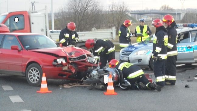 Po przybyciu na miejsce zdarzenia stwierdzono, że samochód osobowy marki Audi 80 zderzył się z motocyklem marki Honda. Na miejscu zdarzenia obecny był patrol Policji, od którego uzyskano informację, że motocyklem przemieszczał się mężczyzna, który został zabrany przez zespół ratownictwa medycznego jeszcze przed przybyciem zastępów Państwowej Straży Pożarnej. W Audi 80 jechały dwie osoby, które o własnych siłach opuściły pojazd i nie uskarżały się na żadne dolegliwości. Działania zastępów PSP polegały na zabezpieczeniu miejsca zdarzenia, odłączeniu akumulatorów i zakręceniu zaworu gazu w butli w Audi 80. Na miejsce zdarzenia przybyli pracownicy Zakładu Usług Miejskich – przedstawiciele zarządcy drogi. Po usunięciu pojazdów z jezdni, zebrano rozlaną plamę płynów eksploatacyjnych za pomocą sorbentu z nawierzchni drogi. Na tym działania zakończono.