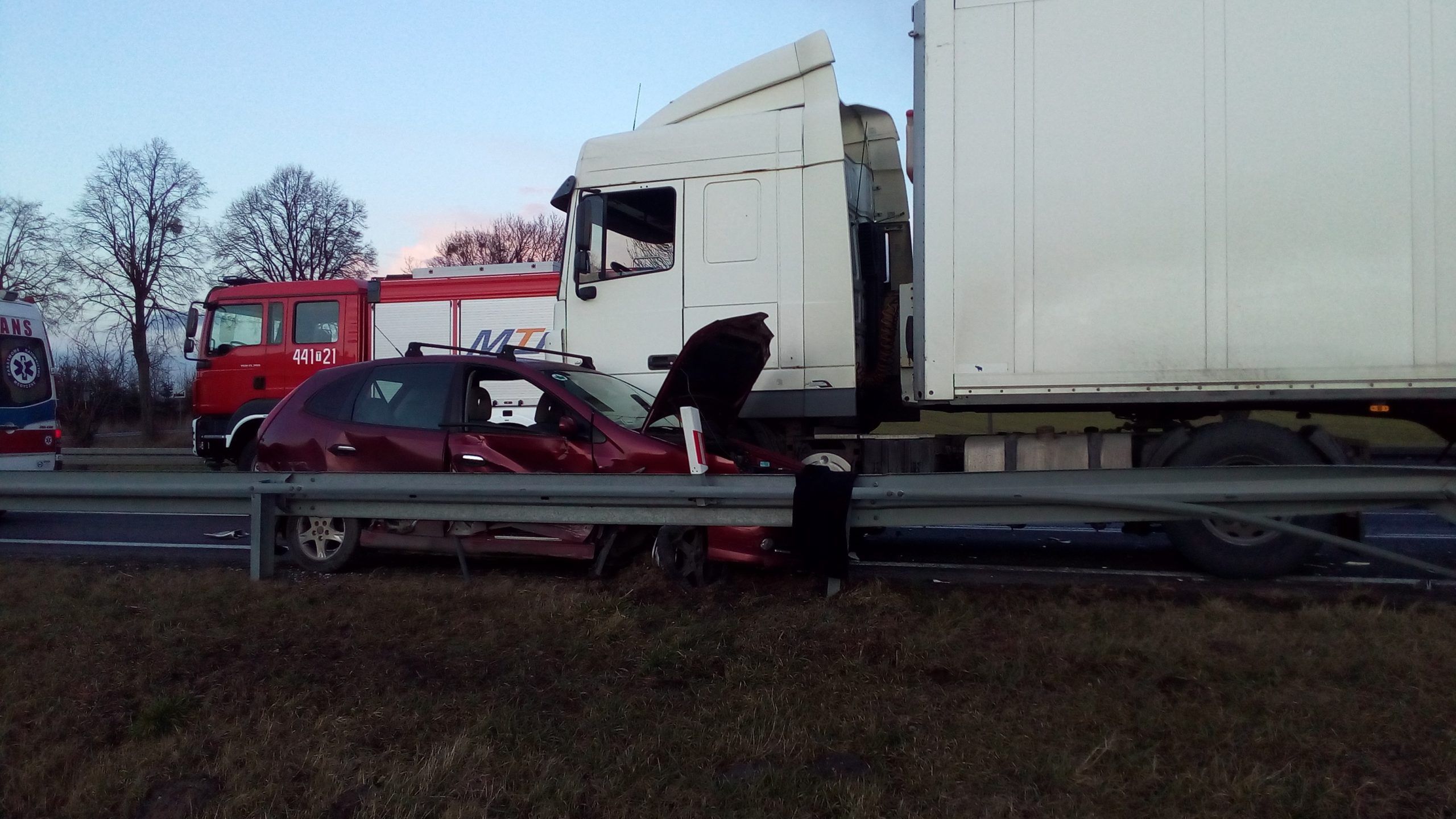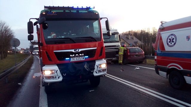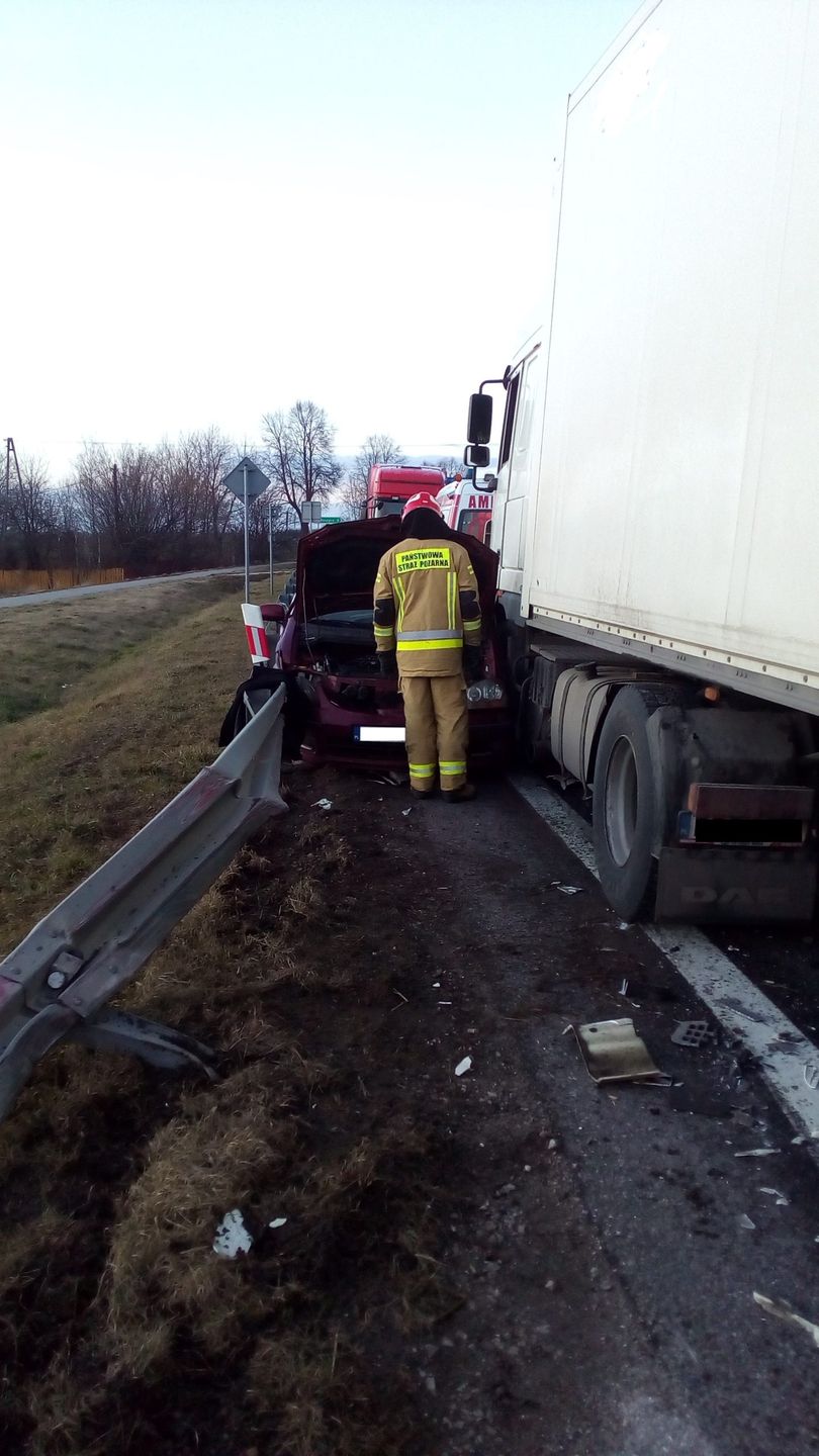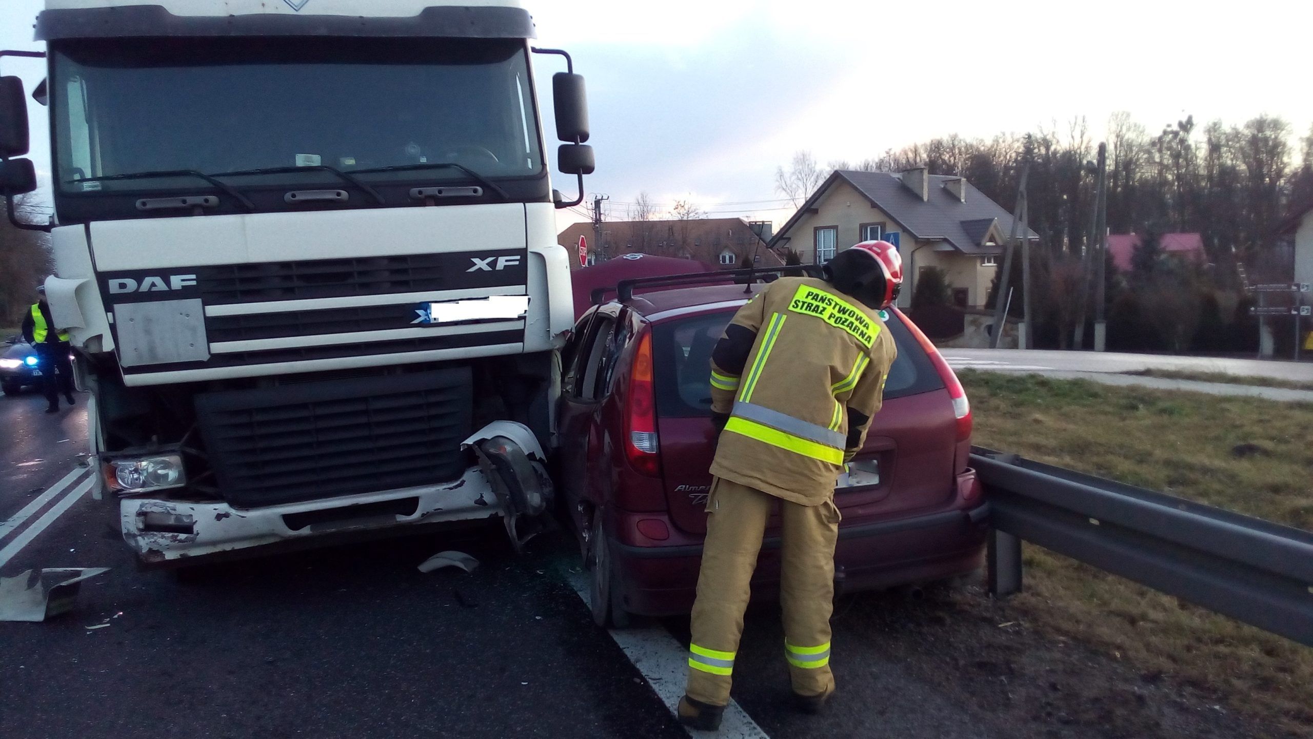 Na Drodze Krajowej nr 9 w miejscowości Jacentów doszło do zderzenia samochodu osobowego marki Nissan i ciągnika siodłowego marki DAF z naczepą, na której przewożone były materiały budowlane. Kierująca i pasażerka samochodu osobowego znajdowały się w pojeździe i nie mogły go opuścić ze względu na zablokowane drzwi. Działania zastępów straży pożarnej polegały na zabezpieczeniu miejsca zdarzenia, pomocy kobietom w opuszczeniu pojazdu, odłączeniu akumulatorów w pojazdach oraz zakręceniu zaworu butli LPG w samochodzie Nissan. Osoby podróżujące pojazdami nie odniosły żadnych obrażeń i po przebadaniu przez przybyły na miejsce Zespół Ratownictwa Medycznego pozostały na miejscu zdarzenia. Po zakończeniu czynności prowadzonych przez Policję uprzątnięto z drogi pozostałości powypadkowe.