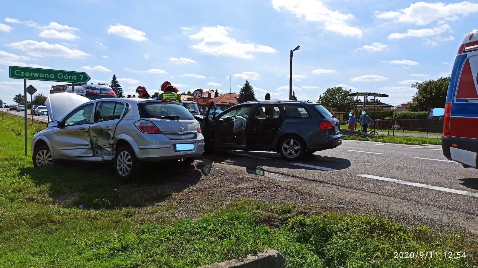 Na skrzyżowaniu drogi powiatowej z drogą krajową nr 9 w miejscowości Jacentów doszło do zderzenia dwóch samochodów osobowych: Opel Astra, którym podróżowała jedna osoba (20-letnia kobieta) oraz Audi A4, którym podróżowały 3 osoby (24-letnia kobieta oraz 2 dzieci w wieku 2 i 5 lat). Pojazdy zajmowały część skrzyżowania i pobocza oraz wyciekały z nich płyny eksploatacyjne. W wyniku zdarzenia i prowadzonych działań ratowniczych ruch na drodze odbywał się wahadłowo. Wszystkie osoby uczestniczące w zdarzeniu opuściły pojazdy przed przybyciem straży pożarnych i znajdowały się pod opieką Zespołów Ratownictwa Medycznego. Działania Straży Pożarnej polegały na zabezpieczeniu miejsca zdarzenia, stabilizacji pojazdów, odłączeniu akumulatorów w samochodach oraz sorpcji rozlanych płynów eksploatacyjnych. Po przebadaniu przez Zespół Ratownictwa Medycznego 2 osoby biorące udział w zdarzeniu zostały zabrane do szpitala. Po zakończeniu czynności dochodzeniowych prowadzonych przez Policję uprzątnięto pozostałości powypadkowe z jezdni.