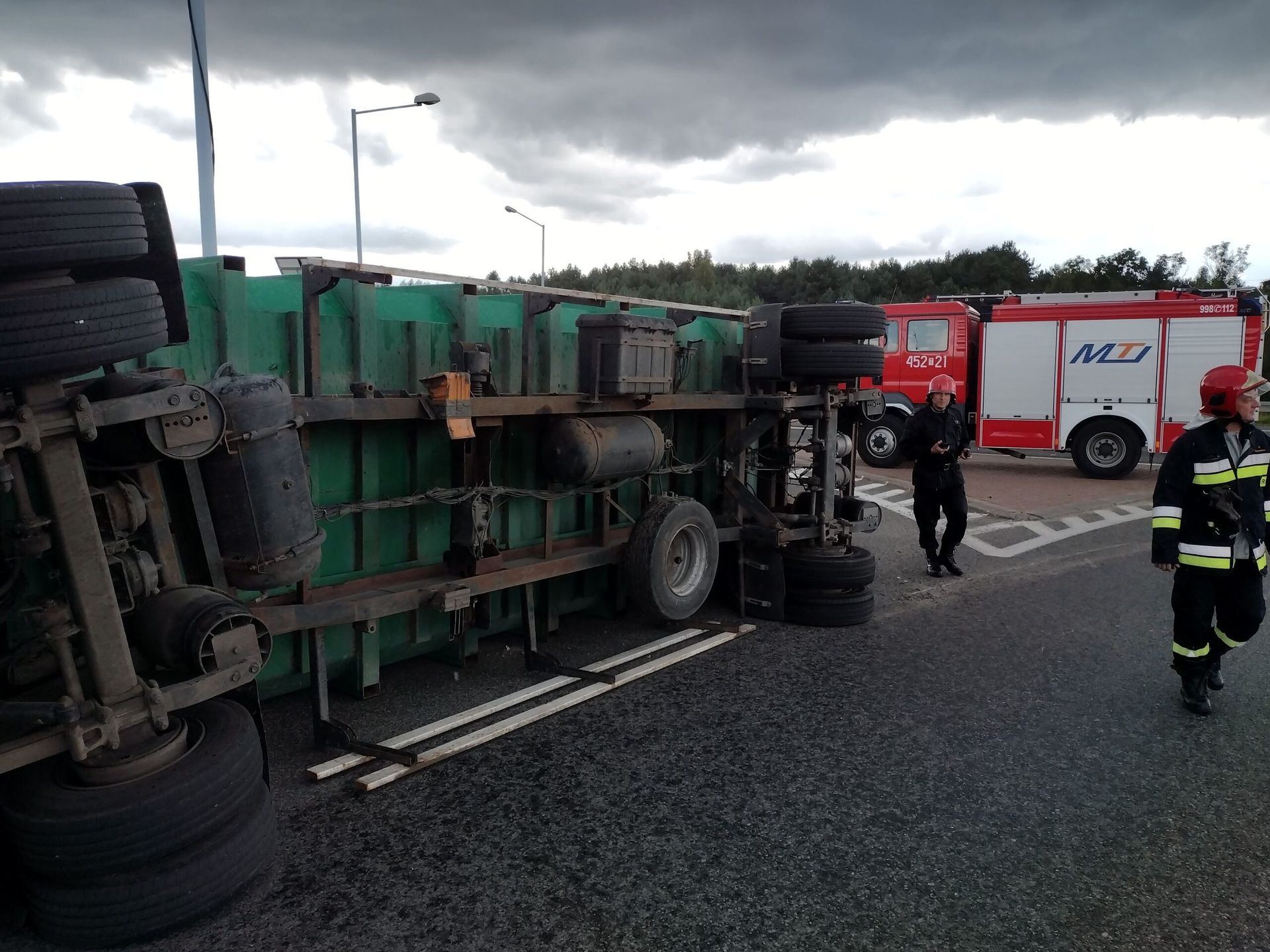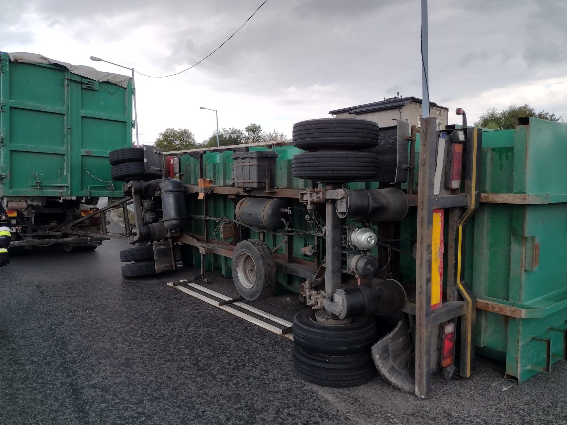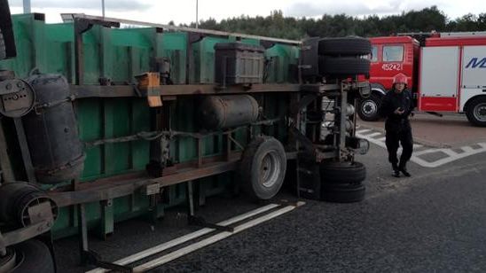 Wywrócona przyczepa samochodu ciężarowego na Drodze Krajowej Nr 9