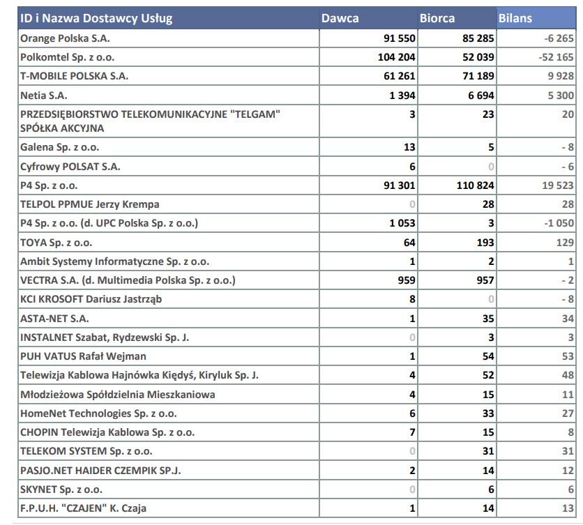 W wyniku przenoszenia numerów Orange Polska stracił 6 265 użytkowników kart SIM, Polkomtel (operator sieci Plus) 52 165, T-Mobile zakończył kwartał, zyskując 9 928 nowych użytkowników, a P4 (operator sieci Play, dane bez UPC Polska) zyskał 19 523 użytkowników kart.